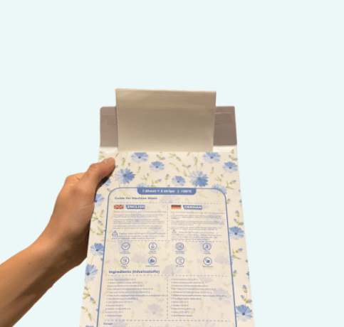 Die Waschblätter von Etheral werden aus leichten, umweltfreundlichen Materialien hergestellt, sodass keine großen Waschmittelflaschen aus Kunststoff erforderlich sind, die unsere Umwelt schädigen.